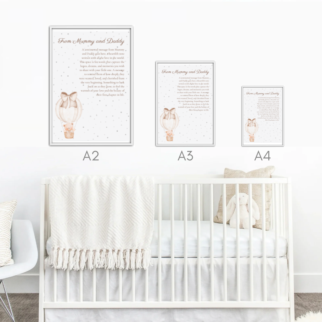 Celebrate the love between parents and their little one with our “From Mummy and Daddy” Personalised Letter Print. This customisable keepsake can be tailored to suit every family — available as From Mummy and Daddy, From Mummy and Mummy, or From Daddy and Daddy. Featuring a soft pastel design with a whimsical hot air balloon, it’s a beautiful way to capture your heartfelt message and remind your child how deeply they are loved from the very beginning.